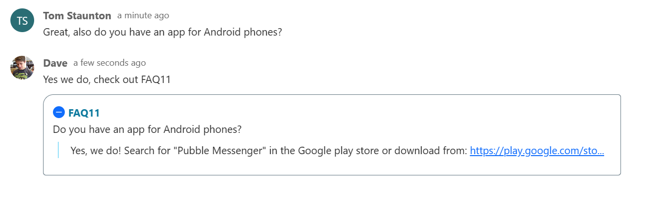 Every time you create an FAQ you share knowledge within your community. Not only that, Pubblebot will prompt relevant FAQs to visitors when they ask a questions. This helps reduce answering the same questions repeatedly and allows you to work more efficiently. You can also manually reference an FAQ in conversations