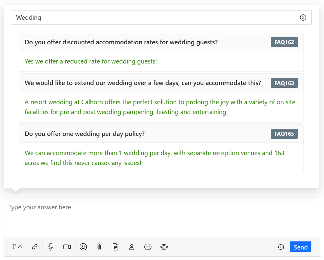 Each FAQ has a unique number making it easy to reference. What if a user asks a question half way through an ongoing conversation and you already have the answer detailed in an FAQ? Just type 'FAQ' followed by the FAQ number, for example "FAQ12" and that FAQ will be added to the chat for the user to see.