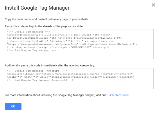 - Next you will get a popup with the code snippet. Copy the code snippets and paste into every page of your site just below the opening tag.