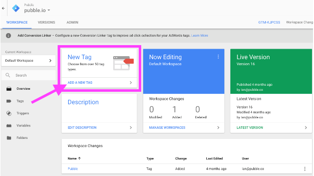 - In your GTM Workspace, click the "Add a New Tag" option.