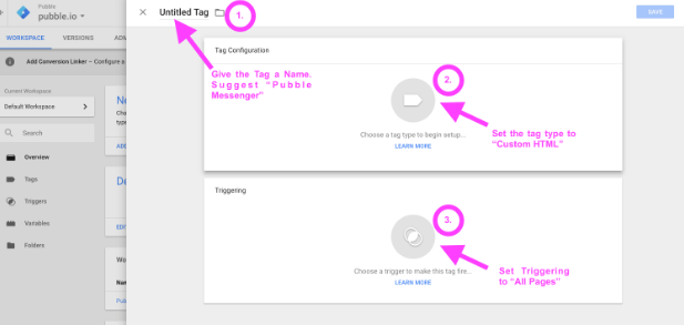 - Click "Untitled Tag" and rename the tag "Pubble Live Chat"